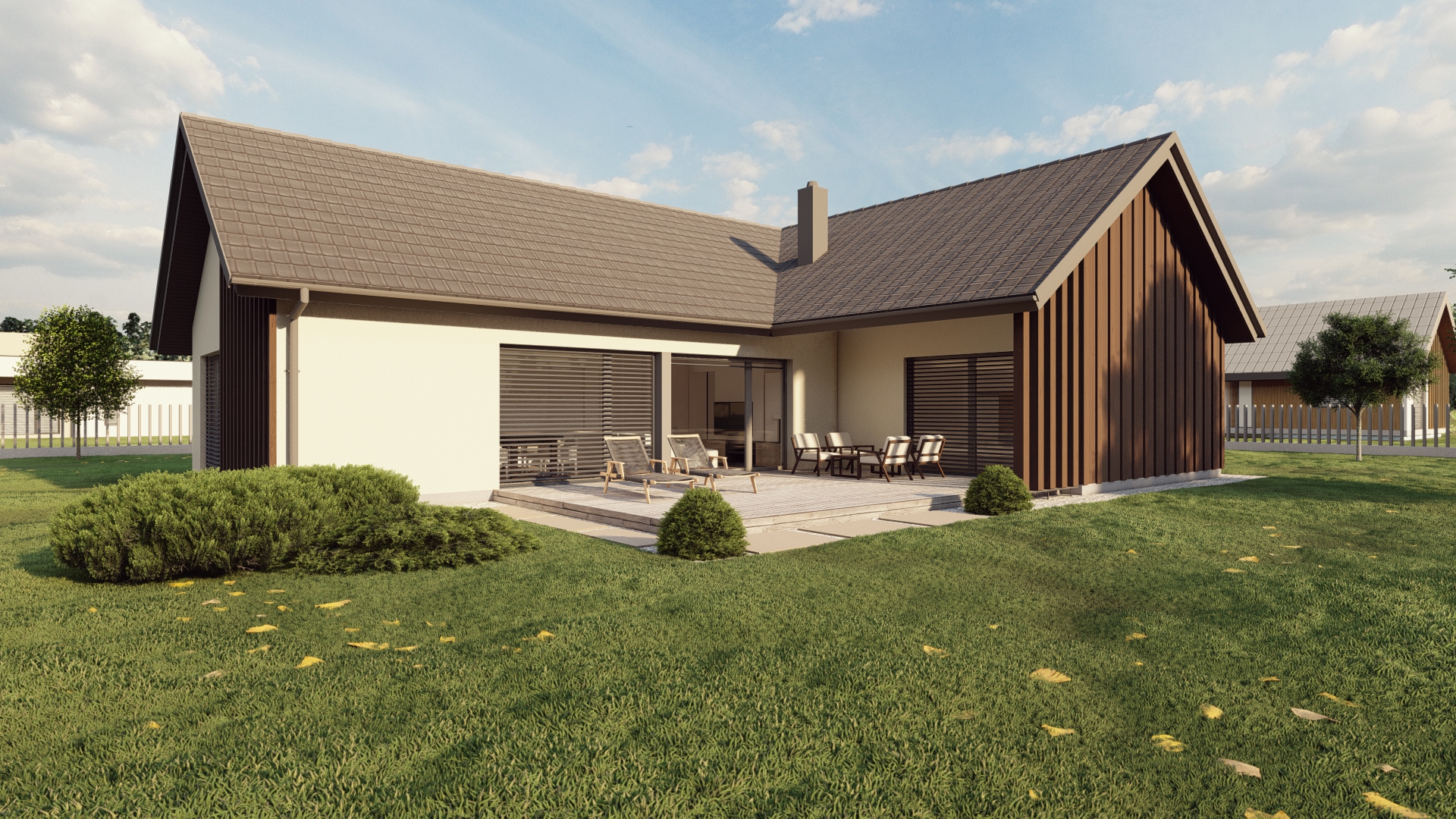 Lesena montažna hiša Jelovica Prima 125 je sodobna pritlična hiša z odprtim bivalnim prostorom, veliko kuhinjo z otokom, prostorno dnevno sobo s kaminom in povezavo na zunanjo teraso, ki ustvarja svetel, prijeten ambient. Pametna razporeditev vključuje tehnični del z garderobo in shrambo ter spalni del s tremi sobami in dvema kopalnicama, kar zagotavlja udobje in funkcionalnost za pare ali družine v vseh življenjskih obdobjih.