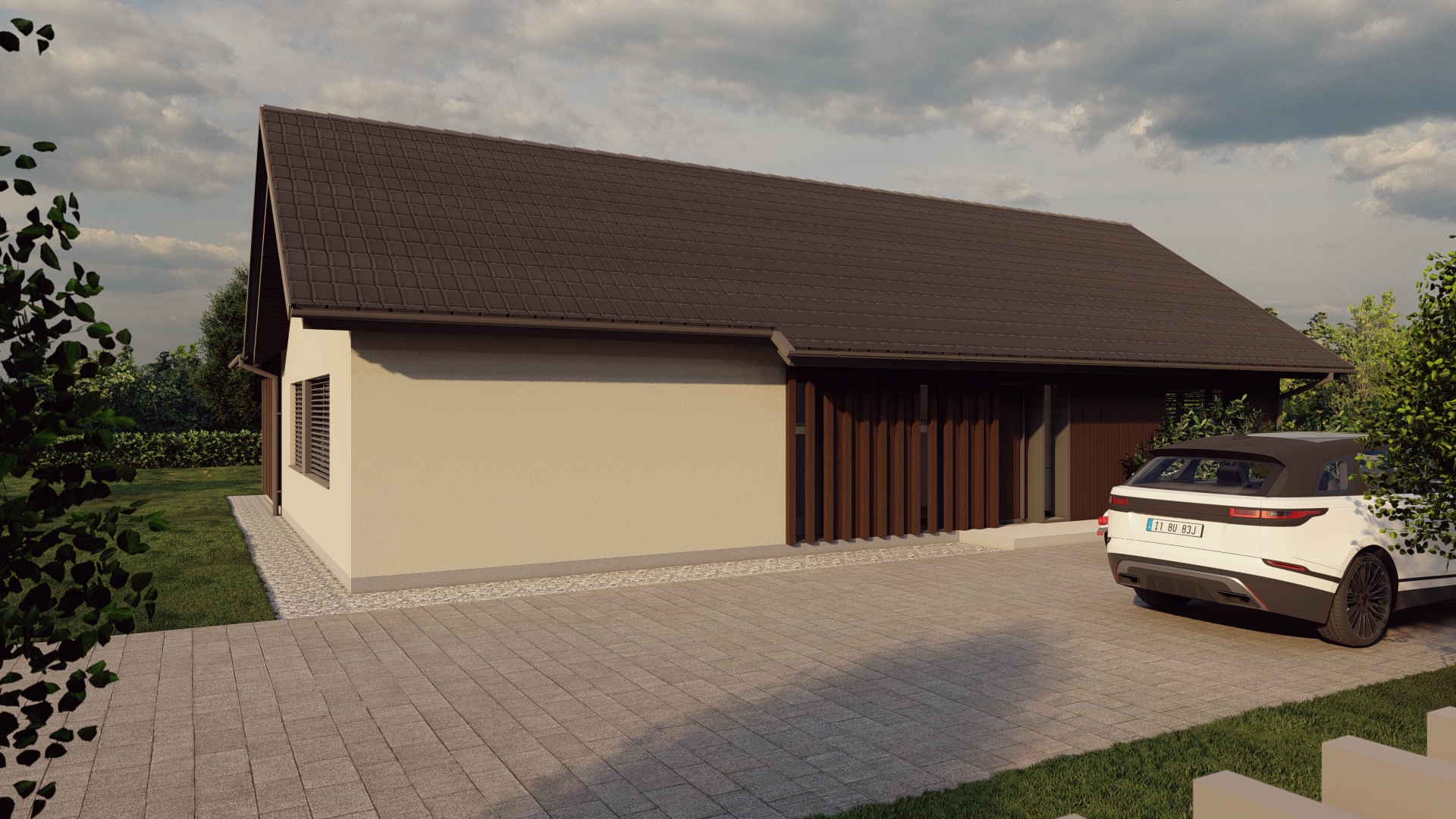 Sodobna pritlična hiša z odprtim bivalnim prostorom.